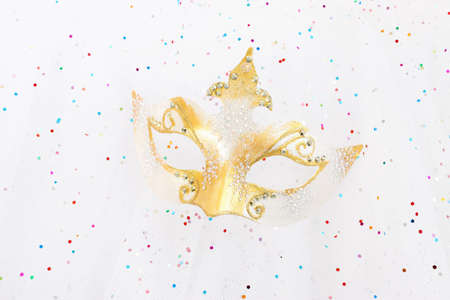 Photo of elegant and delicate Venetian mask over white glitter chiffon background