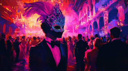 Guests at a lavish masquerade ball wear stunning costumes, adorned with intricate masks, surrounded by a colorful, lively atmosphere as they dance and celebrate the evening.