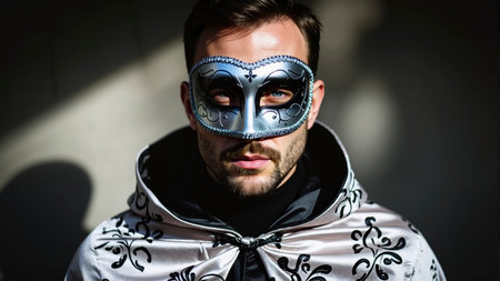 A striking portrait of a man wearing a decorative mask and a stylish cloak, exuding mystery and sophistication. Generative AI.