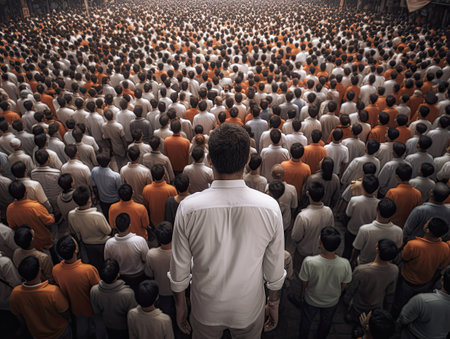 Generative AI illustration of distant person standing in middle of crowd on street representing concept of crowd control and leadership