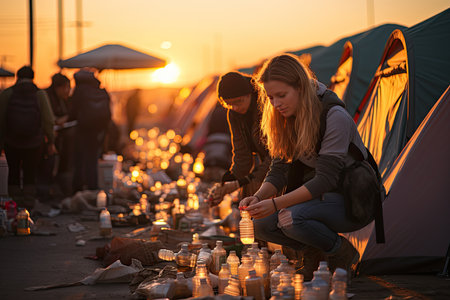 People gather for a peaceful protest in the city center during twilight. The streets are illuminated, and participants hold banners expressing their demands and solidarity. Generative AI.