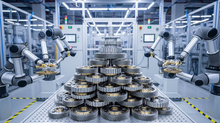 Industrial automation concept. Automated manufacturing robot arm and gear in factory. Automation manufacturing process.