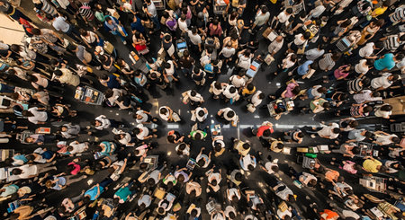 High-angle view of a large crowd of people in a public space, showing diverse interactions and urban life.