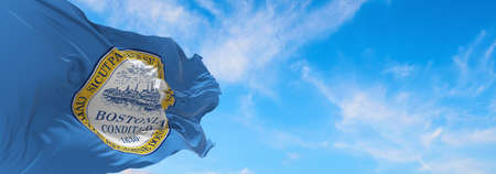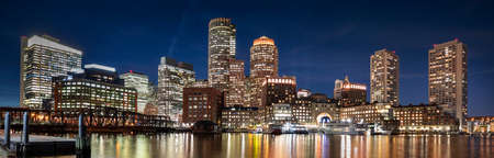Panoramic picturesque city view of Boston Harbour at sunny day, Massachusetts. An intellectual, technological and political center. Building exteriors of financial downtown.