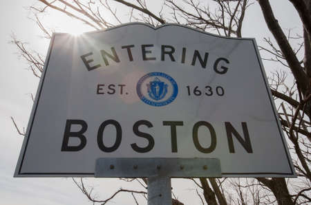 Boston, USA - city name sign with background photo.