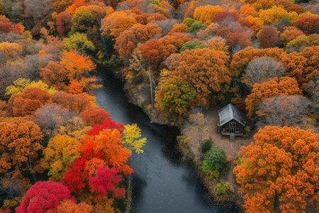 Aerial View of a Picturesque Lake Surrounded by Autumn Foliage in Vibrant Red, Orange, and Yellow Colors. Concept of Nature, Fall, Tranquility, Scenic Landscape.