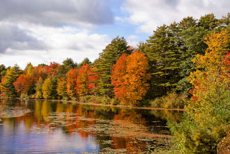 Fall foliage reflects in the still waters of a New England lake. Vibrant reds, oranges, and yellows paint the trees along the shoreline, creating a stunning landscape.
