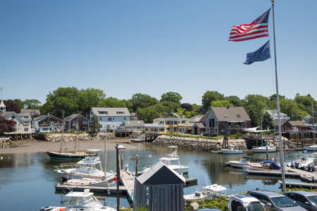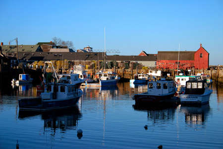 Rockport, MA, USA - oct, 2022 Dinghies and working lobster boats populate Rockport, Massachusetts Harbor. high quality photo