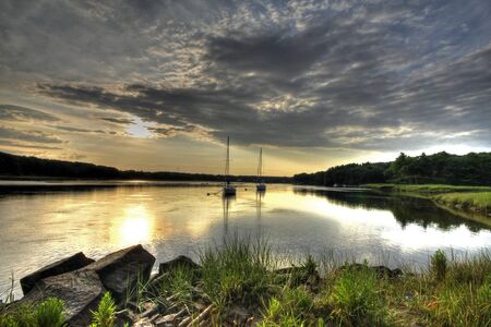 Sunset over piers in the Piscataqua River, in Portsmouth, New Hampshire.