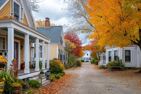 In a picturesque historic town, vibrant autumn leaves surround a beautifully restored house overlooking a peaceful river, reflecting the season's charm.