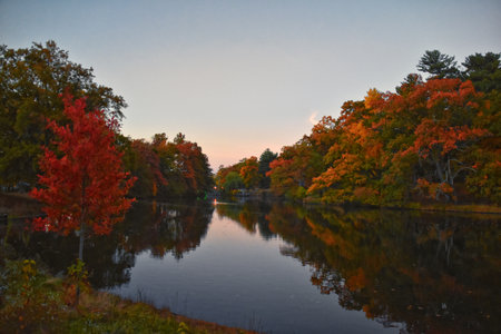 Roger Williams Park, Rhode Island, USA - October 10, 2024 fall leaves at dusk Willow Lake and Pleasure Lake, United States