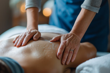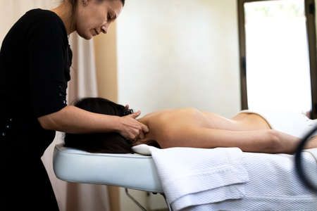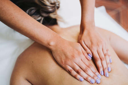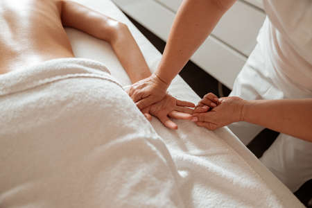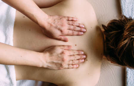 Unrecognizable therapist making higher back and spine massage to a female patient. Relaxing and de-stress