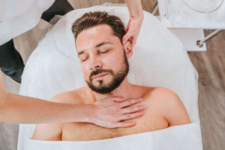 Close up shot of a professional masseuse doing face and head massage for her male client. Handsome young man relaxing receiving facial massage at the spa center. Relaxation therapy resort recreation.