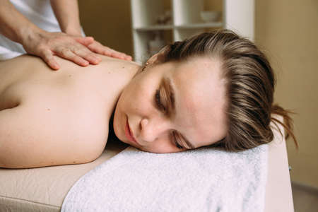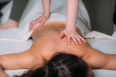 Professional massage therapist massages the back of young unrecognizable woman lying on massage table, close-up. Beautiful naked girl with perfect skin gets relaxing massage. Concept of body care.