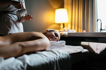 Beautiful woman enjoying oil massage whily lying on massage bed