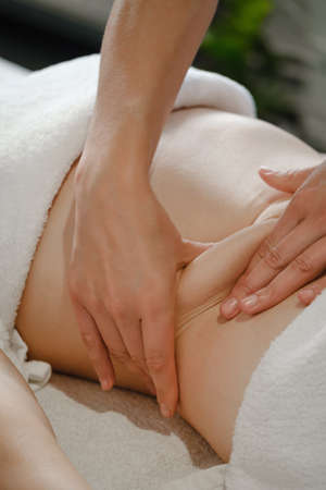 Top view of hands massaging female abdomen. Therapist applying pressure on belly. Woman receiving massage at spa salon, Japanese Chi Nei, Closeup