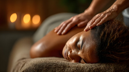 Attractive african girl having massage relaxing in spa salon. Closed eyes. Closeup of happy african woman receiving back massage at salon spa.