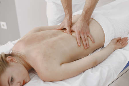 Professional masseur working with the back of a wellness spa center client. Remedial and therapeutic professional massage of woman's back