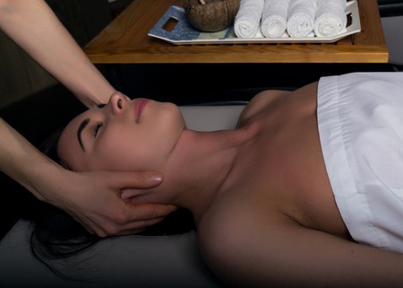Young beautiful woman is getting a relaxing neck massage in a wellness center. Masseur doing massage the head of an young beautiful girl woman in the spa salon close up macro