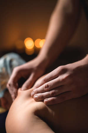 Male strong hands massage back to middle aged woman in dark spa room by candlelight