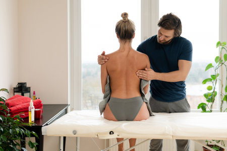 Masseur man doing back massage for his woman client