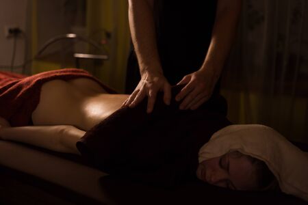 Professional male masseur doing massage for woman client with hot towel at spa salon, studio. Warm romantic illumination, low key. Wellness, relaxation and healthcare concept