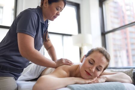 Young woman receiving a back massage in a spa center. Female patient is receiving treatment by professional therapist