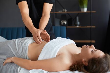 Young beautiful woman enjoying anticellulite belly massage in spa.Professional massage therapist is treating a female patient in apartment.Relaxation,beauty,body treatment concept.Home massage.