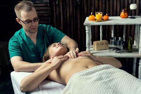Acupressure of a woman’s chest. Man masseur makes massage to a young woman