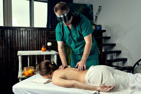 The master gives a back massage to the client. Providing massage services to a client in a private clinic.