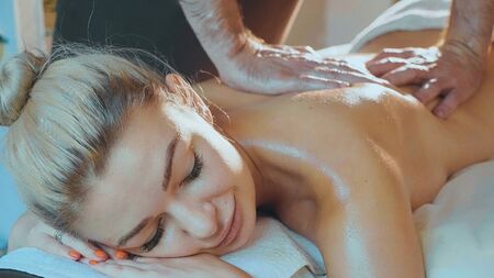 Male massagists hands massaging attractive ladys back. Beautiful young woman is lying on the couch at luxury spa salon and getting a massage.