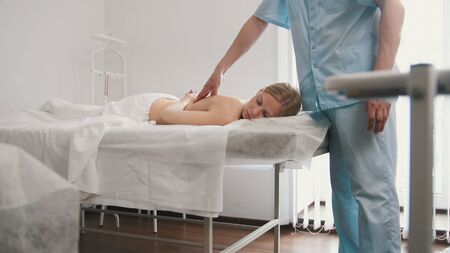 Physiotherapist working doing a massage on a patient back. Concept of physiotherapy and rehabilitation