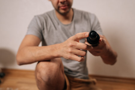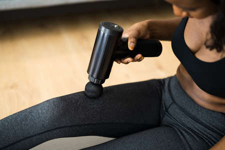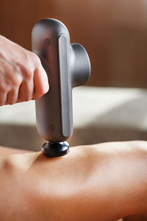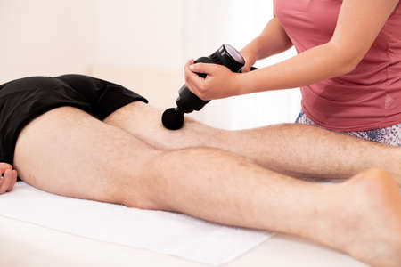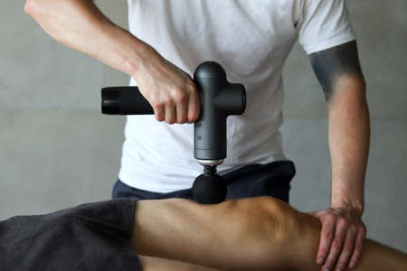 Athlete receives a massage with a percussion gun to relieve pain from muscle soreness in his legs.