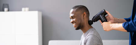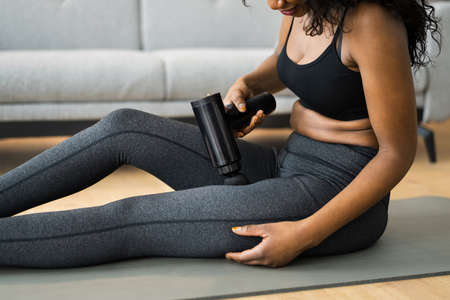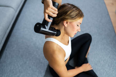 Sport Physiotherapist Using Massage Gun Machine for Recovery Therapy on African American Woman's Bad Posture after Workout