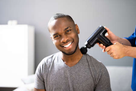 Professional massage with a percussion back massager for a man. Working as a percussion massager
