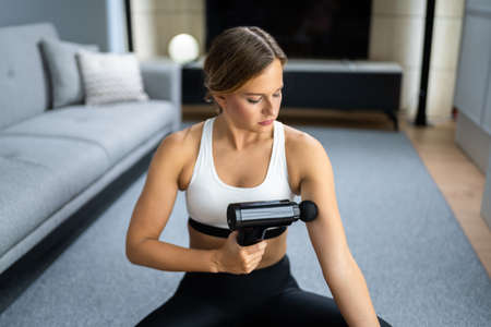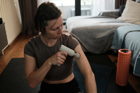A woman uses a massage gun on her arm after training, focusing on muscle recovery and gentle relaxation in a peaceful home environment