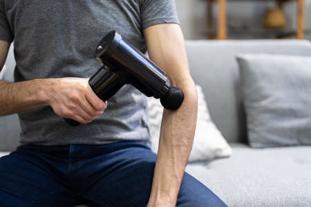a young caucasian man is using a massage gun to massage the muscles of his arm next to his elbow, sitting on a couch