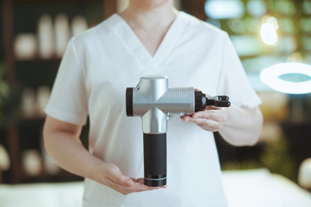 Healthcare time. Closeup on female medical massage therapist in spa salon with massage pistol.