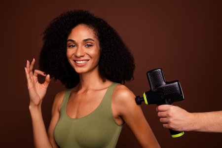 No filter studio photo of slender positive woman wear lingerie showing okey enjoying gun massage isolated brown color background