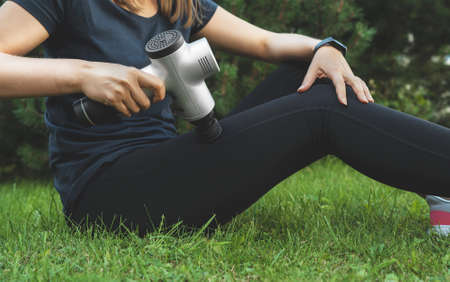 Massage of women's legs with a shock massage device. Shock self-massage to restore fascia muscles and trigger points