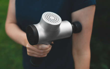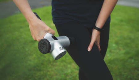 Person holding massage gun. A person in athletic wear holding a percussive massage gun outdoors for muscle recovery.