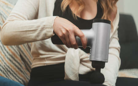 A woman massages her legs with an automatic pistol at home. Shock self-massage to restore fascia muscles and trigger points