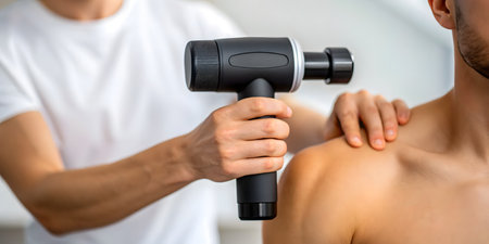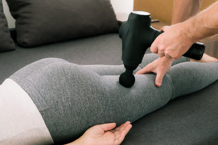 Therapist using massage gun to promote recovery after injury or intense activity by improving blood flow to area