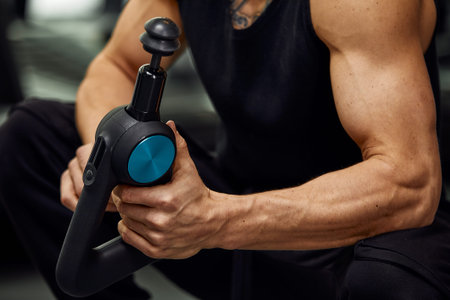 A young man is using and enjoying percussion massage gun to relax and relief the pain in body and muscles in the gym