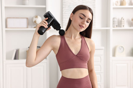 AI generated person using a percussion massager on their shoulder after a workout. This image captures recovery, self-care, and relaxation, offering a calm, focused moment for health wellness content.