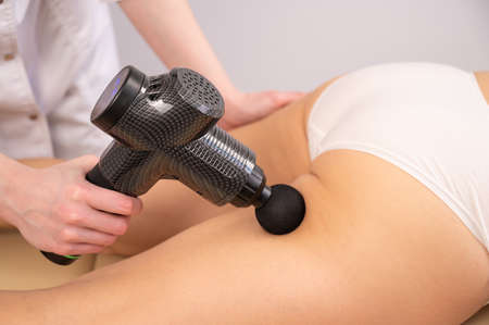 Female massage therapist does massage exercises on the hips with the help of a shock vibrator massager to a female client at home. Shock therapy for a restorative massage of the athletic body