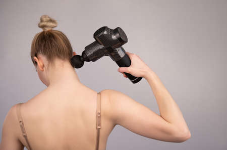 Woman massages the patients back with a percussion massager. Concept of new technologies for acupressure of trigger points. Therapeutic massage and back treatment