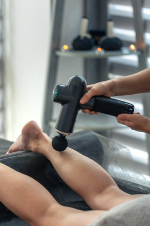 Percussion calf massage for recovery in modern spa. Calf massage device.