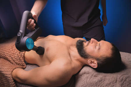 Close-up of a Caucasian male pectoral muscle percussion massager working out in a professional massage parlor