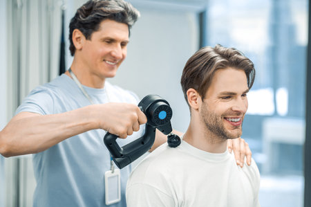 Medical professional performing therapeutic shoulder massage using handheld device for pain relief. Patient in sportswear seated in medical office environment